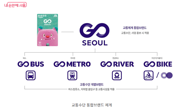 서울시는 대중교통을 더욱 편리하고 직관적으로 이용할 수 있도록 **‘GO SEOUL(고 서울)’**이라는 새로운 교통 통합브랜드를 도입했습니다.