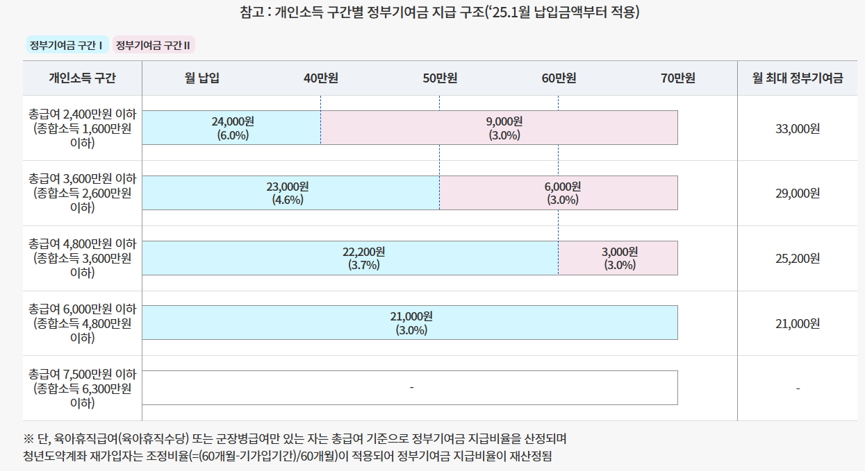 | 개인소득 구간 | 월 납입액(최대 70만 원) | 정부기여금 비율월 | 최대 정부기여금 |
