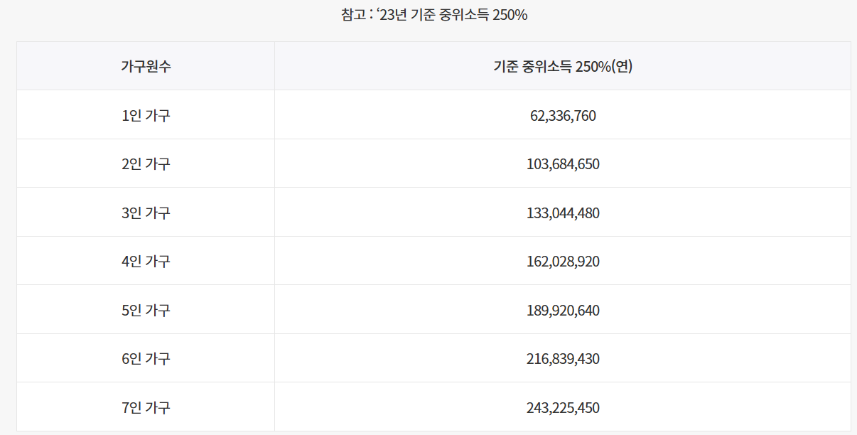 - 가구원 수에 따른 기준 중위소득 250% 이하.