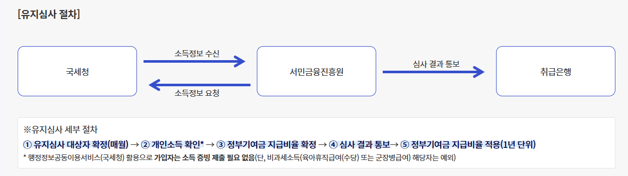 - 개인소득 재확인 절차: 가입자의 개인소득 정보를 확인하여 정부기여금 지급비율을 조정.
